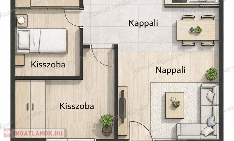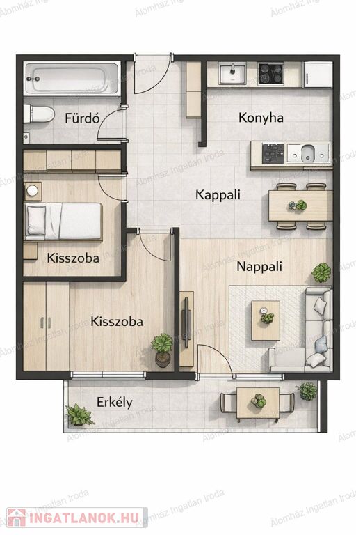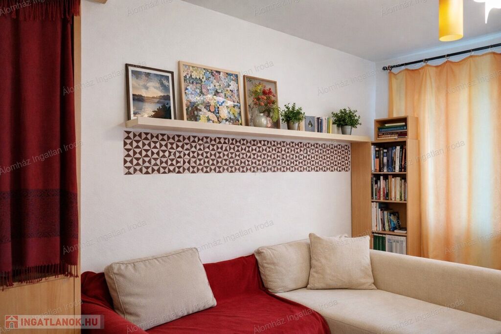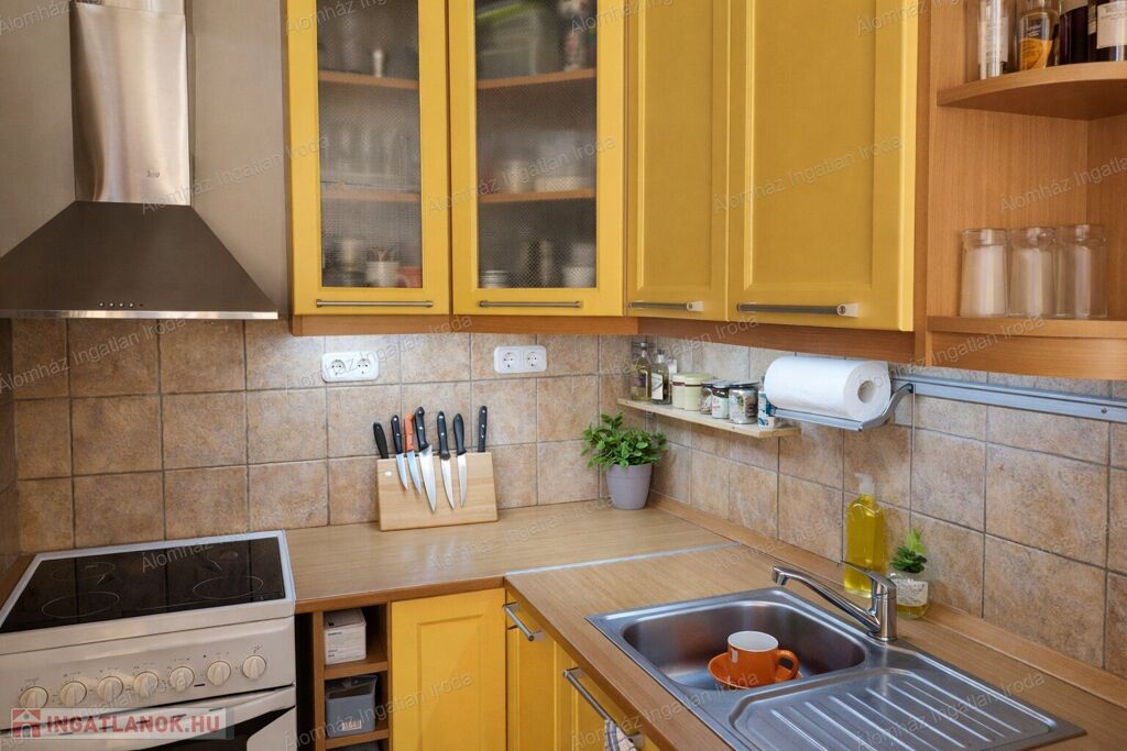 A lakás elrendezése rendkívül praktikus: a világos nappali kellemes életteret biztosít, míg a külön nyíló félszoba ideális hálónak vagy dolgozószobának. A beépített konyha modern és jól kihasználható. Az erkély tovább növeli a komfortérzetet.